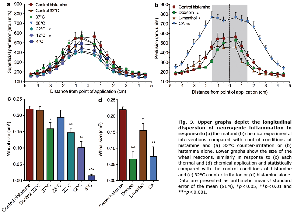 Fig. 3. Upper graphs depict the longitudinal dispersion of neurogenic inflammation in response to (a) thermal and (b) chemical experimental interventions compared with control conditions of histamine and (a) 32°C counter-irritation or (b) histamine alone. Lower graphs show the size of the wheal reactions, similarly in response to (c) each thermal and (d) chemical application and statistically compared with the control conditions of histamine and (c) 32°C counter-irritation or (d) histamine alone. Data are presented as arithmetic means?±?standard error of the mean (SEM), *p?<?0.05, **p?<?0.01 and ***p?<?0.001.