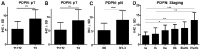Regarding advancement of the disease, increased PDPN expression was found in advanced vs. early MF (p < 0.0001; Mann–Whitney test; Fig. 2B). PDPN expression increased with more infiltrated cutaneous lesions (tumours, stage T3) and with more extensive skin involvement (erythroderma, stage T4, compared with less infiltrated skin changes with the limited involvement of the body surface (patches and plaques, stages T1, T2) (p = 0.0004, p = 0.0014, respectively, Mann-Whitney test; Fig. 3A, B). Moreover, higher PDPN expression was associated with nodal involvement, N1-3 vs. N0 (p < 0.0001; Mann–Whitney test; Fig. 3C). Evident trend of increased PDPN expression was found in higher stages of MF clinical advancement (Mann–Whitney test; Fig. 3D). In contrast, no association between VEGF-C expression and disease advancement, extracutaneous involvement as well as staging in MF was disclosed.