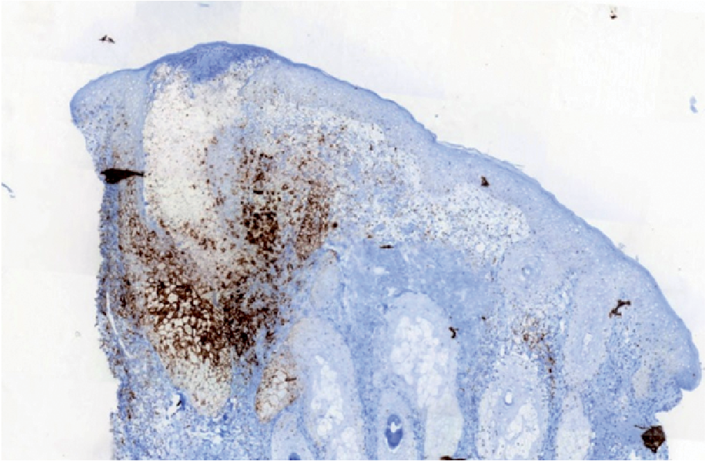 Fig. 2. PD-L1 immunostaining individualizing a strong positivity in the lympho-histiocytic infiltrate, associated with exocytosis into the pilosebaceous follicle (×50 magnification Ventana Ultraview DAB Detection Kit; Antigen retrieval was a standard automated process on the Ventana BenchMark XT clone SP142, Spring Bioscience, Pleasanton, CA, USA).