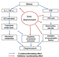 Inflammation is increasingly acknowledged to play a role in the pathophysiology of depression (Fig. 1). The anti-inflammatory actions of antidepressants may be relevant to their anti-depressive effects (22, Fig. 1). In both mice and humans there is compelling evidence that selective serotonin reuptake inhibitors (SSRIs) attenuate inflammatory processes, as mentioned above, also relieving the “sickness behaviour” resembling depression and anxiety symptoms (23, 24). The attenuation of inflammation in animal studies, in vitro human cell lines and patient case reports has been found to involve the modulation of cytokine levels, with a decrease in tumour necrosis factor (TNF)-α and/or an increase in interleukin (IL)-10 levels (24–28).