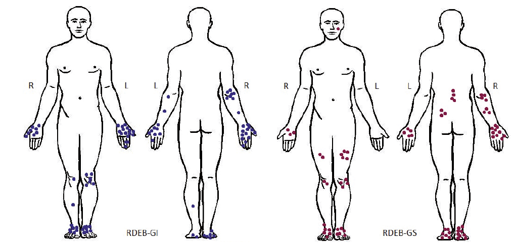 Epidermolysis bullosa (EB), first described in 1886 (1), is a group of rare heterogeneous genodermatoses defined by mechanical fragility, blistering of mucocutaneous membranes, and compromised wound healing (2, 3). The prevalence of EB in Australia according to the Australasian EB registry (AEBR) is approximately 10.3 per million (4). Depending on the skin cleavage plain, EB is classified into 4 major types, i.e. EB simplex (EBS), junctional EB (JEB), dystrophic EB (DEB), and Kindler syndrome. DEB is broadly divided into dominant DEB (DDEB) and recessive DEB (RDEB) (2). Genetic mutations of the COL7A1 gene in DEB result in reduced or absent expression of type VII collagen, which is the main anchoring fibril that attaches the basement membrane of the epidermis to the dermis. RDEB can be further sub-divided into generalized severe (RDEB-GS), generalized intermediate (RDEB-GI). Rare variants of RDEB include RDEB inversa (RDEB-I), RDEB localized (RDEB-loc), RDEB pretibial (RDEB-pt), RDEB pruriginosa (RDEB-pr), RDEB centripetalis (RDEB-ce) and RDEB bullous dermolysis of the newborn (RDEB-BDN) (2).