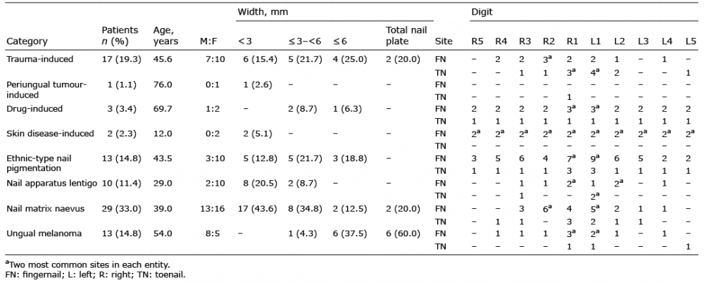 Eighty-eight patients (55.3%; 88/163) had melanonychia, mean age 43.6 ± 23.8 years. There were 34 males and 54 females, a male:female ratio of 0.6:1. The causes of melanonychia are detailed in Table II. The causes of trauma-induced pigmentation included occupational trauma, housekeeping work, nail biting, and indoor climbing in 8 (47.1%), 5 (29.4%), 2 (11.8%) and 2 patients (11.8%), respectively. Periungual tumour-induced pigmentation was observed in one patient, in whom the underlying tumour was a viral wart. The culprit drugs of drug-induced pigmentation were hydroxy-urea, phenytoin and sulfasalazine. Skin disease-induced pigmentation was caused by acanthosis nigricans in 2 patients. Ethnic-type nail (ETN) pigmentation was most commonly observed on multiple nails (84.6%; 11/13) and was more prevalent on fingernails than toenails. All of the lesions involving nail apparatus lentigo (NAL) were observed on a single nail and were less than 6 mm wide. Nail matrix naevus (NMN) was found mainly on a single nail (93.1%; 27/29), was more common on fingernails than toenails, and most frequently affected the right second fingernail. The width of most NMN lesions was less than 6 mm (86.2%; 25/29). Ungual melanoma was found on only one nail, and the most frequently affected site was the first digit (53.8%; 7/13). Most lesions (92.3%; 12/13) showed total involvement or at least 6-mm width. The one case of lesion width between 3 and 6 mm presented irregular longitudinal brown-to-black lines. Nail matrix biopsy specimens revealed 7 and 6 cases of invasive ungual melanoma and melanoma in situ, respectively.