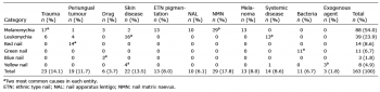 Compared with the studies conducted in Poland (4) and France (9), NMN and ETN pigmentation were more common causes of melanonychia in this study. Palicka & Rhodes (10) reported that the prevalence of acral naevus increased directly with the degree of skin pigmentation. In addition, ETN pigmentation has been mainly observed in dark-skinned individuals (11). Our data, which is consistent with these reports, supports the possibility of different genetic susceptibility to melanonychia across ethnicities. Interestingly, acanthosis nigricans, which is more common in darker skin (12), was the major cause of skin-disease-induced melanonychia in our population, in contrast to the previous European studies in which no patients had acanthosis nigricans. Our data suggests that NMN, ethnicity and acanthosis nigricans may be risk factors for melanonychia in dark-skinned individuals.
