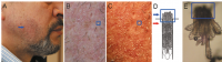 Fig. 4. Follicular scales: detection and significance. (A) Pityriasis folliculorum on the right cheek of a 55-year-old man consulting recently (not included in the study) for symmetrical hyperpigmentation of the beard present for 2 years (blue arrow). (B) Close examination revealed thin whitish follicular scales at the base of the hair, giving a frosted appearance and a rough texture. Each follicular scale corresponds to the most superficial part of numerous opisthosomas agglutinated in the follicle (blue box on B, C, D, E). (C) The scales are more visible when the skin was cleaned with ether and using tangential illumination. (D) Schematic representation of numerous Demodex mites, agglutinated at different levels (arrows) inside the follicle. (E) Microscopic view (×100) of 10 D. folliculorum agglutinated in a single follicle on a standardized skin surface biopsy (SSSB). In this patient, the 2 successive SSSBs revealed 160 and 340 D/cm2 respectively. The final diagnosis was demodicosis: pityriasis folliculorum with secondary post-inflammatory pigmentation on phototype V. Patient permission was obtained.