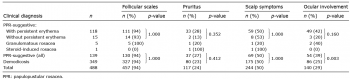In this subgroup, the presence of scalp symptoms and presence of an associated facial seborrhoeic dermatitis were related (p < 0.001). The total concordance was 58% (65/488 had both signs and 219/488 had neither).