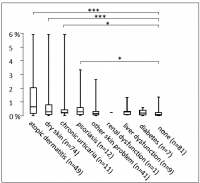 Fig. 7. Watch-recorded total scratching duration (% out of total sleep duration) in each disease category in Study 3. *p < 0.05, ***p < 0.001, Wilcoxon rank-sum test.
