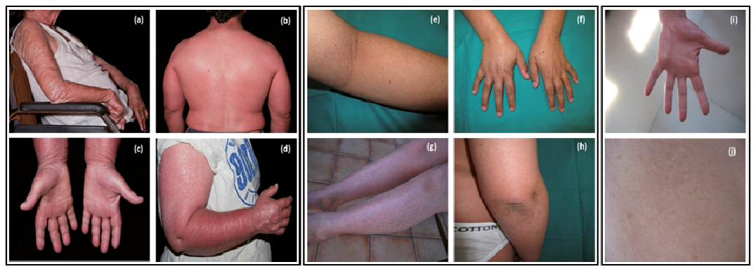 Fig. 1. Clinical photos of patients from families 23 (a–d), 62 (e–h) and 115 (i, j). a) Arms of the proband with generalized erythema and large adherent scales, b and c) back and hands of proband´s son with generalized erythema accompanied by fine white scales and palmar hyper linearity, respectively, d) proband´s daughter showing underlying erythroderma and generalized scaling, e) large whitish scales in legs with underlying erythema, f) dry scaly skin on hands, g) fine white scaling in extensor areas, h) very mild affected flexor surfaces, i) palmar hyper linearity, j) mild generalized scaling.