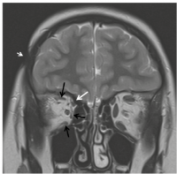 Fig. 1. Coronal T2-weighted magnetic resonance imaging (MRI) image showing focal subcutaneous tissue loss in the right fronto-parietal region (arrowhead) and atrophy of the extraocular muscles of right orbit: superior, medial and inferior rectus (black arrows) and superior oblique (white arrow).