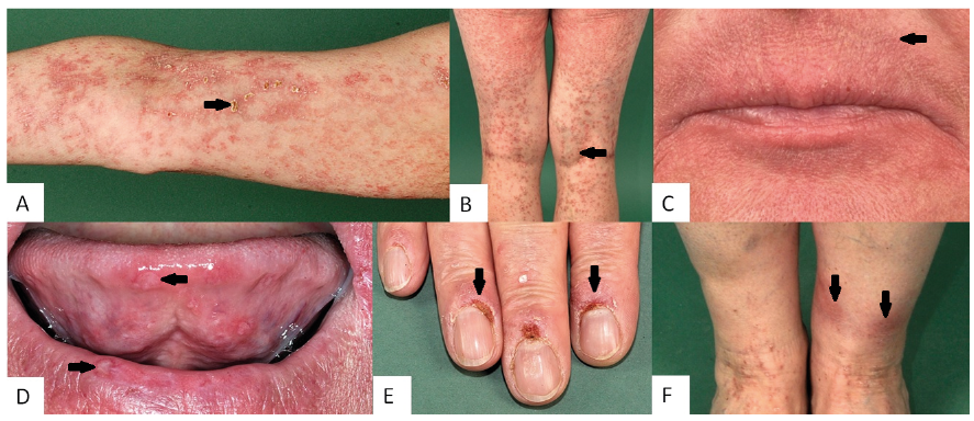 A 63-year-old woman presented with a 6-year history of a cutaneous eruption in a distinctive linear and reticular pattern. Hyperkeratotic dark erythematous papules with fine white scaling were spread mainly on the interior sides of her arms (Fig. 1A) and legs (Fig. 1B). Erythema and scaling was present on the perioral region (Fig. 1C). In addition, she had painful oral ulcers on the mucosal lips, buccal mucosa and tongue (Fig. 1D). Periungual erythema and swelling was present on the fingers (Fig. 1E). She had tender, erythematous subcutaneous nodules on the lower legs (Fig. 1F).