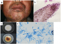 Fig. 1. a) Multiple follicular papules, multiple pustules and painful subcutaneous nodules on the bearded area of the patient. b) Chains of arthroconidia within and on the hair shafts (periodic acid-Schiff stain x400). c) The isolate from the biopsy specimen (KMU 9922). The surface of a colony after 14 days of incubation on Sabouraud dextrose agar at 27°C. d) Slide culture after 14 days of incubation (Cotton-blue stain).