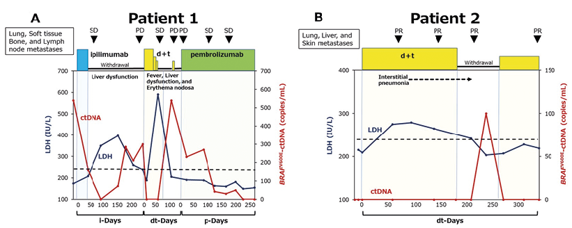 This study examined the efficacy of ctDNA monitoring during treatment with immune checkpoint inhibitors and small molecule-targeted medicines. LDH is a useful marker for disease monitoring because elevations are frequently associated with a high disease burden and a poor prognosis (1). However, it can be difficult to determine whether LDH elevation is caused by therapy-related AEs. Immune checkpoint inhibitors and small molecule-targeted medicines can cause damage to various organs, resulting in increased LDH levels independent of tumour progression. Conversely, LDH levels can remain within the normal range despite tumour progression. CtDNA is also a useful marker of tumour load during treatment of patients with melanoma (5, 6). Here, we show that measuring ctDNA is a reliable tool for disease monitoring because ctDNA levels reflect tumour burden independently of therapy-related AEs. In addition, ctDNA levels in patient 2 fell 4 days after treatment resumption. Similar rapid responses were observed previously (7). Also, the short half-life (approximately 2 h) of ctDNA means that it is likely to reflect tumour status in real-time (8).