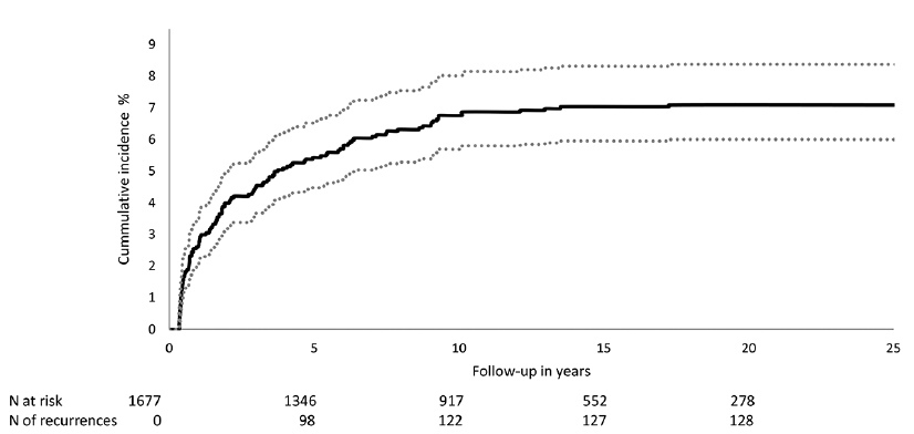 Fig. 3. Cumulative incidence curve of the first recurrence with 95% confidence interval of dermatofibrosarcoma protuberans, which were diagnosed between 1989 and 2013 and followed-up until 2015 using data from the Dutch nationwide pathology database. The majority of recurrences occurred within 5 years of follow-up.