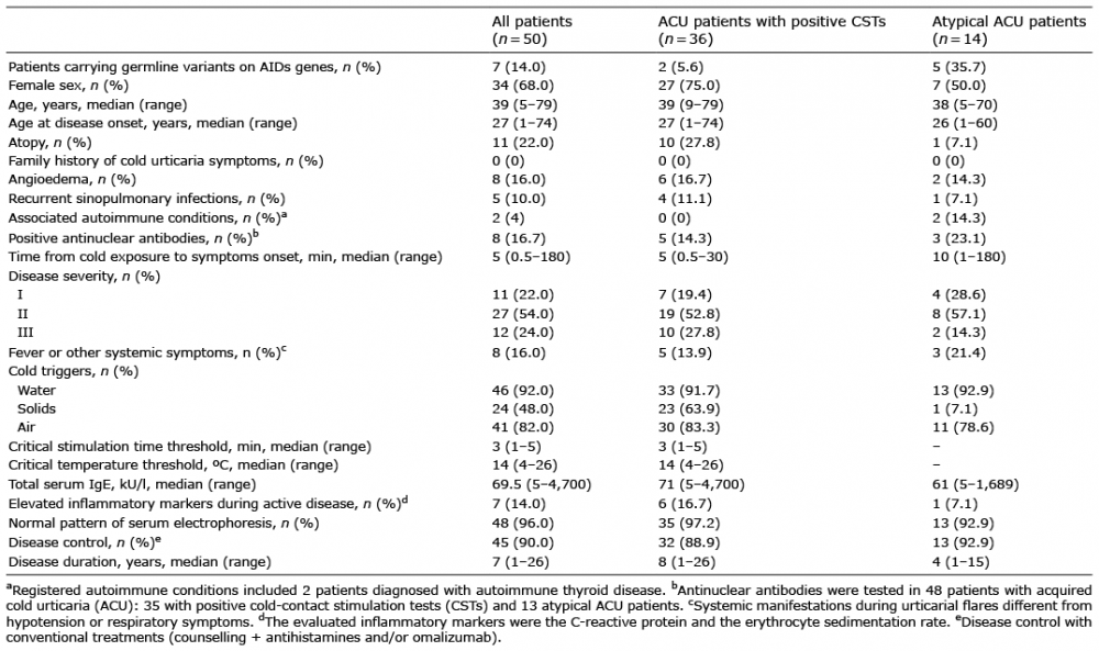 A total of 50 patients fulfilling the inclusion criteria were enrolled in the study. Clinical and demographic characteristics of such patients are summarized in Table I. The median (range) age at disease onset was 27 (1–74) years, and 34 (68.0%) patients were female. None of the 50 patients referred family history of similar symptoms (urticarial skin rashes after cold exposure). Thirty-nine (78.0%) patients experienced generalized urticaria after cold exposure (types II and III reactions), with 12 (24.0%) showing severe reactions with ≥ 1 episode suggestive of hypotension or respiratory distress. Other reported systemic symptoms during urticarial flares include arthralgias (n = 5), abdominal pain (n = 2) and myalgias (n = 1). Fourteen (28.0%) patients were diagnosed with atypical ACU due to the negative results of the CSTs. Regarding response to treatment, which was evaluated after performing the respective genetic analyses, 38 (76.0%) and 12 (24.0%) patients showed a satisfactory and a poor response to non-sedating H1-antihistamines (doses ranging from 1 to 4 times the recommended dose depending on the patient’s symptoms response), respectively. From these 12 non-responders to antihistamines, 7 were treated with omalizumab, achieving a well-controlled disease (UCT ≥ 12), and the remaining 5 patients have just initiated third-line therapies (omalizumab [n = 4] and cyclosporine [n = 1]) and are pending to assess the clinical evolution.