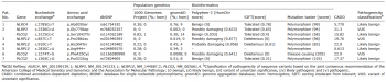 Table III. Clinical features of patients carrying germline variants with allelic frequencies lower than 1% in public databases (1000 Genomes Project, ExAC and gnomAD)