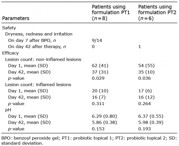 In this study, conducted at the Department of Dermatology in Magdeburg (September to November 2016), a total of 8 patients were randomized to formulation PT1 (age, mean (SD) 19.6 (1.5) years) and 6 to the formulation PT2 (age 20 (2) years). All patients had a mean Leeds score < 3.1 (mild to moderate disease) at the end of the study.