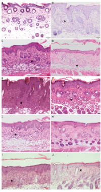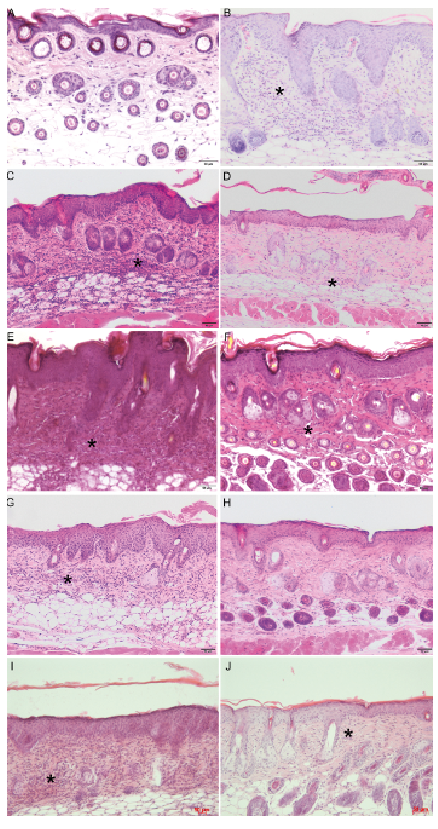 Fig. 4. Imiquimod (IMQ)-induced dermal lymphocytic cell infiltrates. Representative histological pictures of lymphocytic cell infiltrates (asterisks) in the dermis. The treatment of mice using a combination of JNJ-39758979 and amthamine reduced lymphocytic cell infiltrates (asterisks) in the dermis. Skin of mice was treated topically with (A) soft cream or (B–J) IMQ for 10 consecutive days. (A) Skin of mice treated topically with soft cream. No lymphocytic infiltration (score (–)) was visible. (B) Skin of mice treated with IMQ topically. Lymphocytic infiltration (++++) is visible. (C, E, G) Skin of mice treated with vehicle administered intraperitoneally (i.p.) + IMQ topically. Lymphocytes (++++) persisted in the dermal layer (asterisks). (D) Skin of a mouse treated with amthamine i.p. + IMQ topically. Lymphocytes (+++) persisted in the dermal layer (asterisks), but infiltration appeared to be less severe than in mice treated with vehicle i.p. + IMQ topically (C). (F) Skin of a mouse treated with JNJ-39758979 i.p. + IMQ topically. Lymphocytes (+++) persisted in the dermal layer (asterisks), but infiltration appeared to be less severe than in mice treated with vehicle i.p. + IMQ topically (E). (H) Skin of a mouse treated with amthamine + JNJ-39758979 i.p. + IMQ topically. Lymphocytic infiltration (+) of the dermis could only rarely be detected. All drugs were given in a dosage of 20 mg/kg i.p. twice daily and were compared with treatment with vehicle (aqua ad injectionem, twice daily i.p.). (I) Skin of a wild-type mouse treated with IMQ topically. Lymphocytes (++++) persisted in the dermal layer (asterisks), infiltration appeared to be more severe than in H4R–/– mice (+++, J). Bars represent 50 µm.