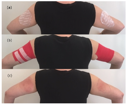 Fig. 1. Areas with touch-evoked itch were identified and (a) patches were cut to cover the areas and (b) applied for 1 h under bandage occlusion. (c) Subsequent erythema of the treated areas of skin.