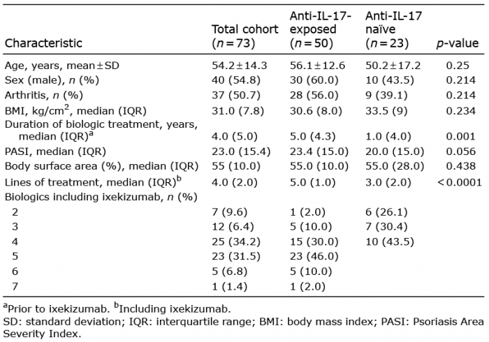 Of the 73 patients in the cohort, 50 had been previously exposed to the anti-IL-17 agent secukinumab; all were switched directly from secukinumab to ixekizumab. The remaining 23 patients were anti-IL-17-naïve. The characteristics of the 2 groups are summarized in Table I. At the time of initiation of ixekizumab treatment (baseline), there were no differences between the groups in sex distribution, mean age, median BMI, involved BSA, and PASI. There was a significant between-group difference in median duration of biologic treatment prior to ixekizumab (5.0 years vs 1.0 year, p = 0.001) and in median number of biologic agents (including ixekizumab) prescribed (5.0 vs 3.0, p < 0.0001).