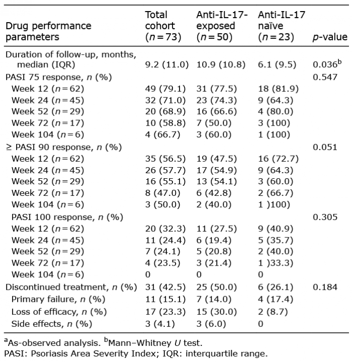Table II. Ixekizumab efficacy and survival in psoriatic patients, whole group and by anti-interleukin (IL)-17 exposurea