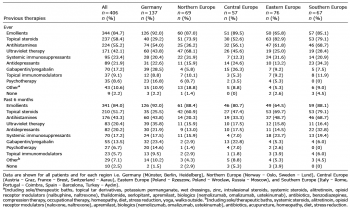 Emollients, topical corticosteroids and antihistamines were the therapeutic regimens applied most often. All other therapies were used to a lower extent (Table I). The median total number [IQR] of drugs used by patients was 4 [2; 6], n = 379, while 1 of 4 drugs taken by the patients was used to treat CNPG (1 [0; 2], n = 375). Patients from Central Europe took a lower amount of drugs for CNPG compared with patients from Northern Europe (p = 0.012), Eastern Europe (p = 0.007) and Southern Europe (p = 0.005).