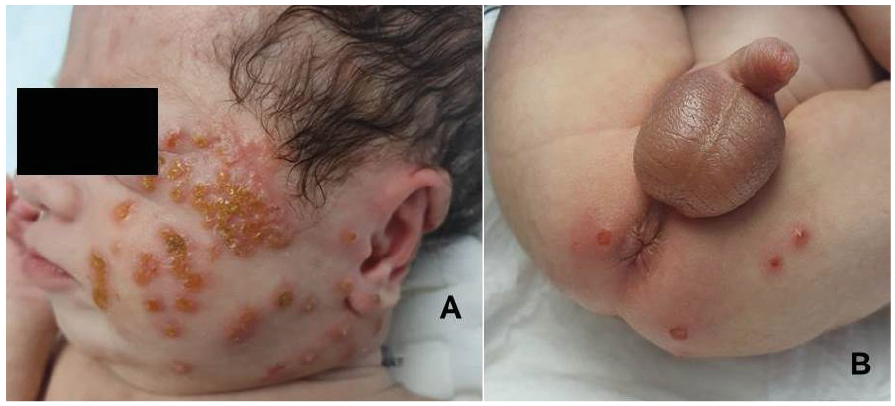 Fig. 1. Pustules and crusts on (A) the face and (B) gluteal area.