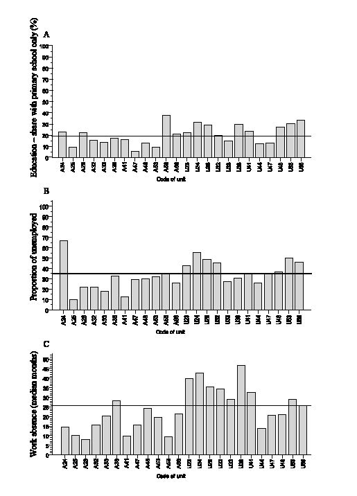 Fig. 2. (A) Education – share with primary school only (%) at the assessment in 2007 (n = 2095). (B) Share of unemployed (%) (n = 2104). (C) Work absence in months (md) (n = 2104) in 2007. Solid line indicates mean. Bottom: A = Units with rehabilitation programmes; U = Units with assessment only; Numbers denotes specific units.