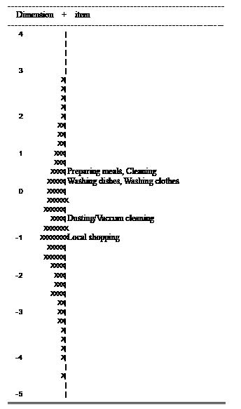 Fig. 2. In the person-item map of domestic chores, the column of numbers to the left is logit. The symbol “X” to the left of the centre-line represents 2.6 participants. The most able people and the most difficult items are at the top, and vice versa.