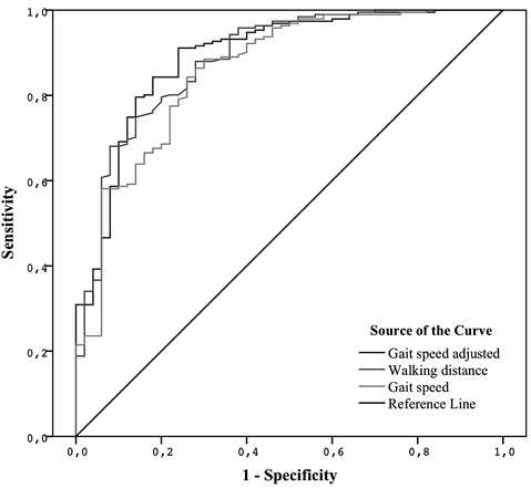 Comparison of the derived ROC curves showed that the AUC was not significantly different between gait speed and walking distance (Z = 1.59, p = 0.1).