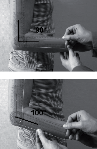 Kinaesthesia was tested based on the procedure described by Thibault et al. (21). The direction of shoulder and elbow joint displacement of unaffected and affected side was measured. The unaffected limb was tested before the affected limb. Limbs were displaced by 10º (Fig. 2). The amount of joint displacement was monitored using a goniometer. The joint was flexed and extended 5 times in a predetermined random order. The participants were asked to identify the direction of the displacement. The number of correct responses was recorded for each joint. The maximum score possible for each joint was 5 points. This procedure is objective, reproducible and suited for use in children aged 6 years and older (21). The reliability of this procedure is excellent (mean Kappa 0.81) (21).