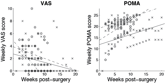 For each weight bearing parameter in each subject a linear equation was fitted to the data. Differences in weight bearing parameters in week 1–8 post surgery between short, intermediate and long rehabilitation groups were assessed with one-way unbalanced analysis of variance (ANOVA). Pain and POMA scores were correlated with weight loading parameters. For analysis, the software programs Statistical Package for the Social Sciences (SPSS) 20.0.0 and Matlab R2011b were used.