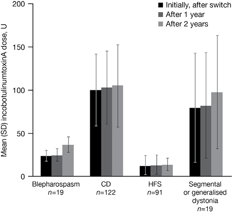 Conclusion: For patients with conditions commonly treated in dystonia clinics, switching from abobotulinumtoxinA to incobotulinumtoxinA, given at equivalent doses (~4:1 unit ratio) at similar intervals, was effective, well tolerated and achieved cost savings.