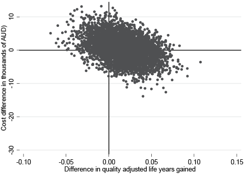 Fig. 1. Cost-effectiveness plane for the difference in quality adjusted life years (QALY). Percentage of observations in each quadrant: north-east = 38.02%, south-east = 38.38%, south-west = 5.94%, north-west = 17.66%. AUD: Australian dollars.