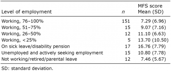 The MFS rating differed significantly with regard to level of employment (Kruskal–Wallis test, χ2 (6) = 26.646, pp < 0.001; Table III); a higher rating on the MFS correlated significantly with a lower level of employment (Spearman, r = 0.29, p = 0.01). Of the 15 unemployed, 8 rated above cut-off on the MFS.