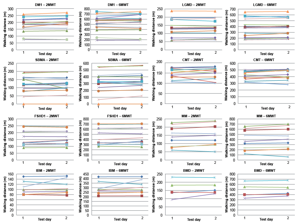 Fig. 1. Walking distance in the 2MWT and 6MWT in individual patients with neuromuscular diseases. 2MWT: 2-minute walk test; 6MWT: 6-minute walk test; DM1: myotonic dystrophy type 1; LGMD: limb-girdle muscular dystrophy; SBMA: spinobulbar muscular atrophy/Kennedy disease; CMT: Charcot-Marie-Tooth disease/hereditary motor and sensory neuropathy; FSHD1: facioscapulohumeral muscular dystrophy type 1; MM: mitochondrial myopathy; IBM: sporadic inclusion body myositis; BMD: Becker muscular dystrophy. The walking distance (m) is on the y-axis and test days on the x-axis.