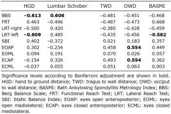 Table IV. Correlation analyses (r values) of balance tests, postural sway and spinal mobility parameters in the patient group