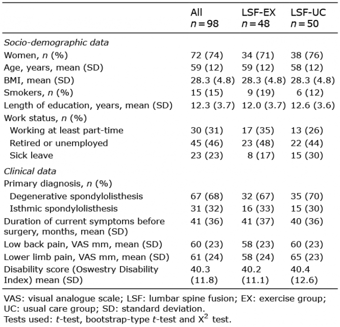 Compliance was assessed by exercise diaries. The median (Q1; Q3) frequency of the back-specific exercise was 2.5 (1.9; 3.4) times per week during the first 2 months of the postoperative intervention in the LSF-EX group. During the last 2 months of the intervention, the frequency was 1.4 (0.6; 1.9) times per week (within-group change p < 0.001). The median (Q1; Q3) numbers of daily steps at the same time points were 6,138 (3,759; 8,907) and 5,870 (3,587; 8,024) (within-group change p = 0.24). No participant reported discontinuance due to harms caused by the exercise programme. Seven patients in LSF-EX discontinued the exercise intervention. Four patients discontinued due to difficulties in commuting to booster meetings. One patient presented with a sudden decline in haemoglobin and general condition and was referred for further examination. A physician advised 1 patient to discontinue exercising, owing to a problem with fixation (patient subsequently had a re-operation and was diagnosed with myopathy, leading to muscle weakness) and one died (myocardial infarction). The intention-to-treat method was used and all patients (n = 98) were thus included in the analysis in their original assigned groups.