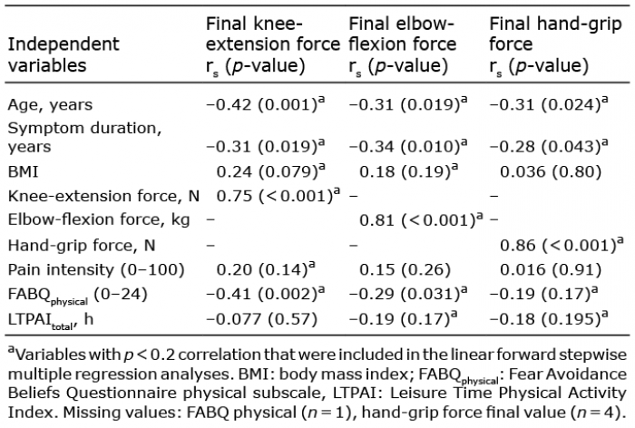 The results of the correlation analyses are shown in Table II. Variables that were found to correlate with change in muscle strength with p < 0.2 were entered into the linear forward stepwise multiple regression of explanatory factors.