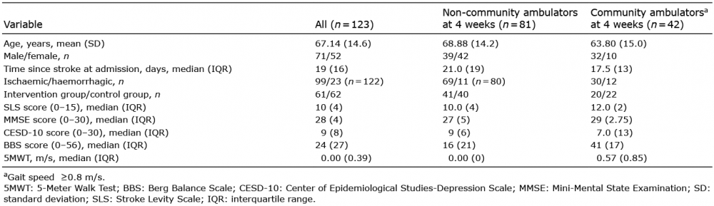 Table I. Participant characteristics at admission to inpatient stroke rehabilitation, grouped by community ambulatorsa and non-community ambulators at 4 weeks