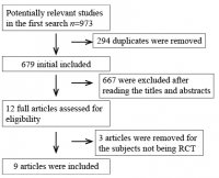 The flow chart for the selection process and detailed identification is shown in Fig. 1. A total of 973 publications were identified through the initial search of databases. Of these, 294 duplicates were removed, 667 studies were excluded (due to irrelevant subject matter) on the basis of initial screening of the titles and abstracts. And 3 papers were removed for the subjects not being RCTs. Ultimately, 9 RCTs were included in the meta-analysis (13, 15–19, 24–26).