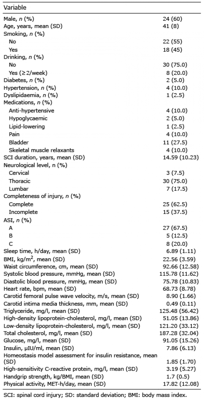 This study included 40 individuals with SCI (mean age 41 (standard deviation 8) years, male 60%) at the cervical (n = 3), thoracic (n = 30) and lumbar (n = 7) neurological levels. The mean duration of SCI was 15 ± 10 years. According to the American Spinal Injury Association (ASIA) impairment scale, 27 participants with SCI were grade A, 5 were grade B, and 8 were grade C. Of the included participants 62.5% had a complete injury and 37.5% had an incomplete injury. None of the participants had an abnormal electrocardiogram or coronary artery disease (previously diagnosed by a physician). All participants abstained from caffeine and exercise on the testing day and were at least 8-h postprandial upon arrival to the laboratory for testing. Written informed consent was obtained from all participants, and all procedures conducted in the present study were in accordance with ethical standards and the Declaration of Helsinki. The study protocol was approved by the Institutional Review Board (IRB) Committee of the University of Seoul (IRB number 2016-02).