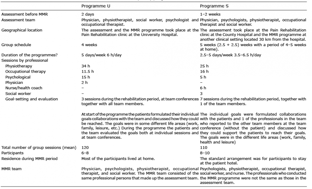 The main differences between the U and S programmes were the length of the programmes, the geographical location and the professionals in the team. In Programme U, both the assessment and the MMR were conducted by the same team of professionals in the same geographical location, the University Hospital. In Programme S, there were different people in the assessment team and in the MMR team: a nurse but no physician participated in the MMR team. The assessment was performed at the hospital, but the MMR programme was conducted in another clinical setting, 30 km from the hospital. In addition, most of the Programme U patients lived at home during the MMR period, while for Programme S, all patients stayed at a patient hotel during the MMR (Table I).