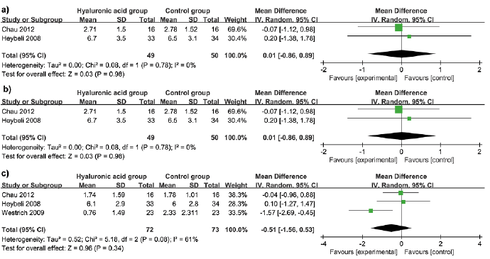 Results: Six RCTs involving 310 patients were included in the meta-analysis. Overall, compared with control intervention following knee arthroscopy, hyaluronic acid treatment was found to significantly increase Western Ontario and McMaster Universities Osteoarthritis Index (WOMAC) scores (mean difference 11.43; 95% confidence intervals (95% CI) 1.39–21.47; p = 0.03), but had no impact on pain scores at 2 weeks (mean difference –0.16; 95% CI –0.81–0.49; p = 0.63), pain scores at 6 weeks (mean difference 0.01; 95% CI –0.86–0.89; p = 0.98), pain scores at 12 weeks (mean difference –0.51; 95% CI –1.56–0.53; p = 0.34). In addition, pain on motion was significantly reduced after knee arthroscopy (risk ratio (RR) 0.22; 95% CI 0.06–0.79; p = 0.02).