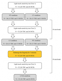 Fig. 1 illustrates the experimental protocols. Participants were exposed to experimental conditions, including no fingertip touch (NT), light fingertip touch (LT), and light fingertip touch after immersion in surfactant-water solution (LTAS) conditions. The 3 conditions were presented in a block design, and the order of the blocks was pseudo-random. Half of the children with DCD and TDC completed the NT condition first, then the LT condition, with the remaining half in the reverse order. Note that, for all participants, the LTAS condition was always administered last due to considerably slower recovery of skin sensitivity from surfactant-water solution immersion (approximately 30 min) (14), and thus was more likely to influence subsequent test results.