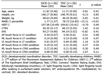 Results: Analysis of variance (ANOVA) revealed that the children with developmental coordination disorder were less sensitive to light touch than typically developing children (p < 0.05). For both groups, immersing a fingertip in surfactant-water solution increased sensitivity to light touch (p < 0.05). Finger soaking enhanced the effects of light fingertip touch on reducing body sway only in those children with developmental coordination disorder (p < 0.05).