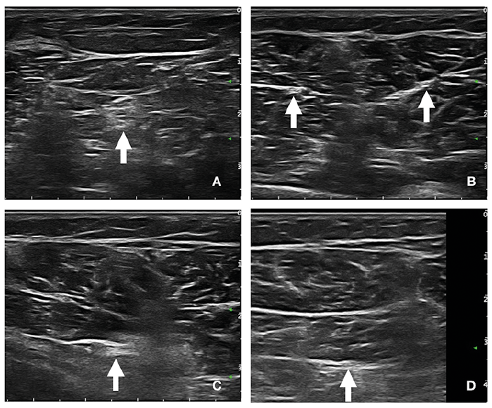 Fig. 1. Ultrasound images of: (A) the tibial nerve trunk, and its motor branches to (B) the gastrocnemii muscle, (C) soleus muscle, and (D) tibialis posterior muscle.