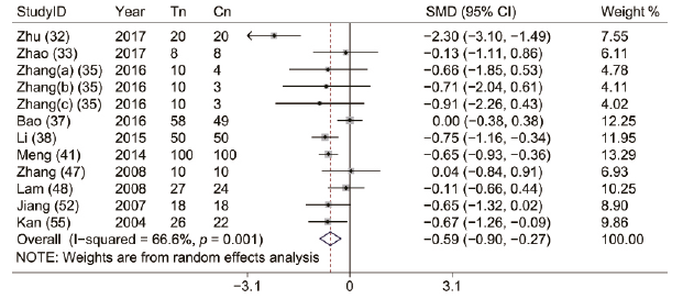 Total cholesterol. Ten studies (32, 33, 35, 37, 38, 41, 47, 48, 52, 55) evaluated the effects of tai chi on TC. A random-effects pooled analysis demonstrated positive effects of tai chi on decreasing TC (SMD –0.59; 95% CI –0.90 to –0.27; p < 0.001; heterogeneity, I2 = 66.6%, p = 0.001; Fig. 6).