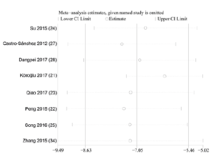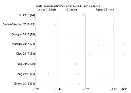 In order to investigate the heterogeneity of sources, sensitivity analysis was conducted to assess the influence of each study on the combined result by removing studies one at a time.