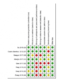 The quality of each included study is shown in Fig. 2. The majority of studies had a low risk of bias in random sequence generation, allocation concealment, incomplete outcome data, and others. However, 5 studies had a high risk of unblinding of participants and personnel, and 4 studies had a high risk of unblinding of outcome assessment. In addition, all studies had a high or unclear risk of selective reporting. Collectively, the quality of included studies was moderate.