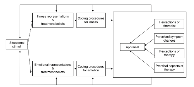 Fig. 1. A dynamic extended model of treatment and illness representations (E-CSM of Self-Regulation). Reprinted with permission of “Treatment appraisals and beliefs predict adherence to complementary therapies: a prospective study using a dynamic extended self-regulation model” by F. Bishop, L. Yardley, G. Lewith, 2008. Br J Health Psychol. 13 (4): 701–718. ©2008 The British Psychological Society (6).