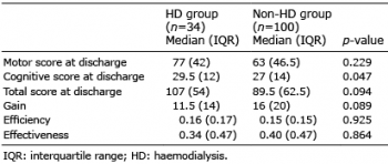 Results: Among 859 patients, 34 (mean age 63.6 years (standard deviation (SD) 11.7)) required haemodialysis while staying in rehabilitation wards. One hundred patients not receiving haemodialysis (mean age 70.7 years (SD 13.8) ) were randomly selected as controls. The total FIM score at discharge, FIM gain, FIM efficiency, FIM effectiveness, and discharge destination were not significantly different between the 2 groups (p > 0.05). Multiple regression analysis, adjusted for other confounding factors, found no significant difference in total FIM score between groups at discharge (p = 0.427).